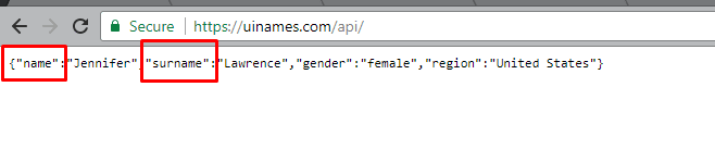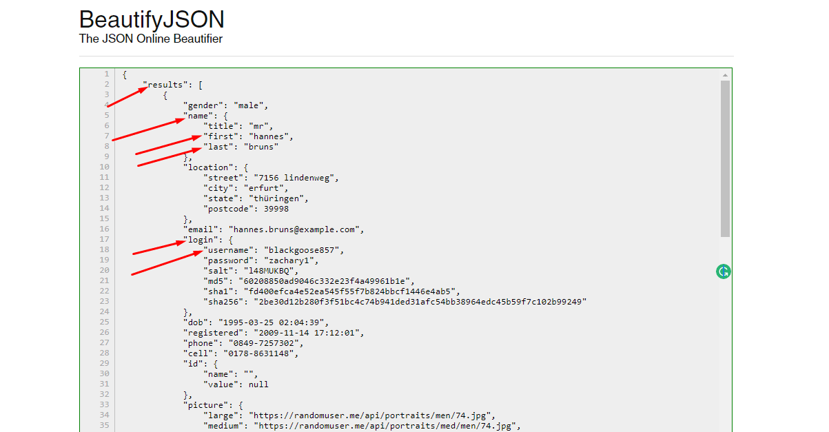 This API returns a nested JSON and I am using beautifyjson.com to make it readable and the parameters we will need are shown below. As per the URL, this API returns two random user profiles.